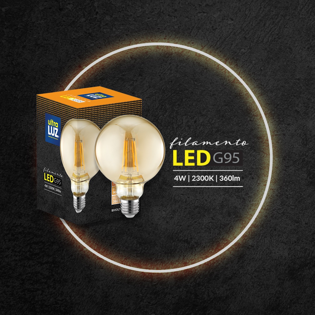 A LED Filamento G95 Ultraluz, por sua vez, conta com um design vintage modernizado, com filamento de carbono e vidro acobreado de 10x14cm de diâmetro, potência de 4W e temperatura de cor de 2300K (amarela). É o maior dos modelos e causa grande impacto visual e luminoso nos ambientes que está presente. Utilizada normalmente em quartos sob poltronas de leitura e em ambientes externos como decks e varandas semi cobertas. É frequentemente combinada com decoração envolvendo textura de madeira e cimento fosco em diversas luminárias tripé e unidimensionais.
